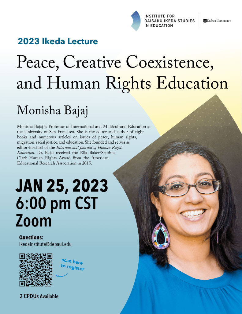 The DePaul University Institute for Daisaku Ikeda Studies in Education is pleased to welcome Monisha Bajaj to give the 2023 Ikeda Lecture, “Peace, Creative Coexistence, and Human Rights Education.” Professor of International and Multicultural Education at the University of San Francisco, Dr. Bajaj is an internationally renowned author and educator. Her scholarship on peace, human rights, migration, racial justice, and education has been recognized with multiple prestigious awards, including the Ella Baker/Septima Clark Human Rights Award from the American Educational Research Association (AERA).